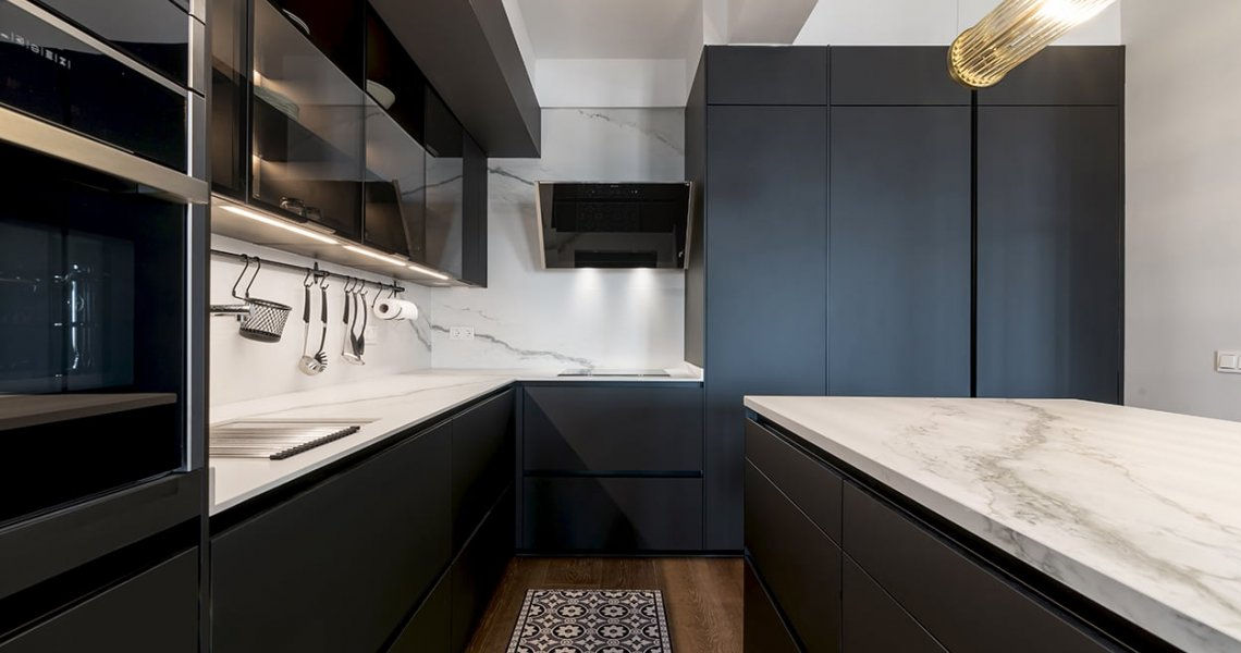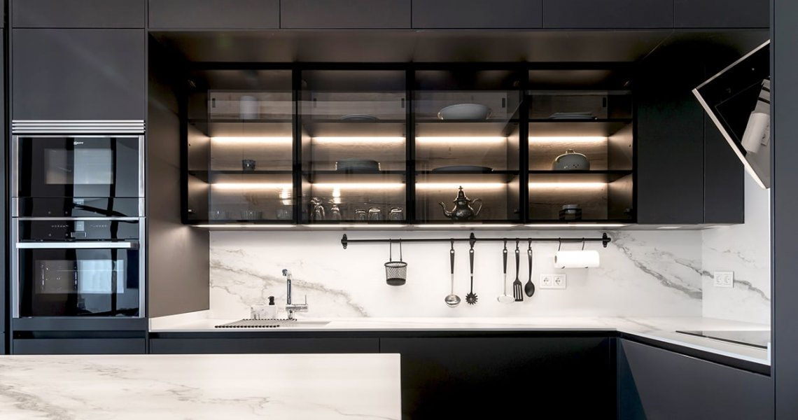 La distribución de esta cocina negra moderna cuenta con 2 frentes en forma de L.