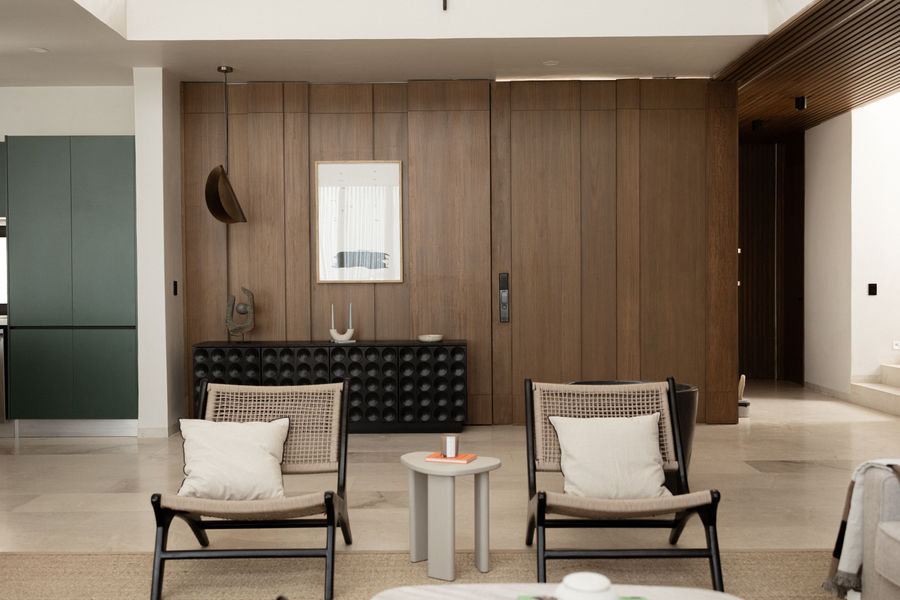La amplia sala en forma de L, adyacente al comedor, está amueblada con dos emblemáticas sillas Venecia y un librero de acero con detalles en mármol Santo Tomás, añadiendo un toque de sofisticación y practicidad al espacio