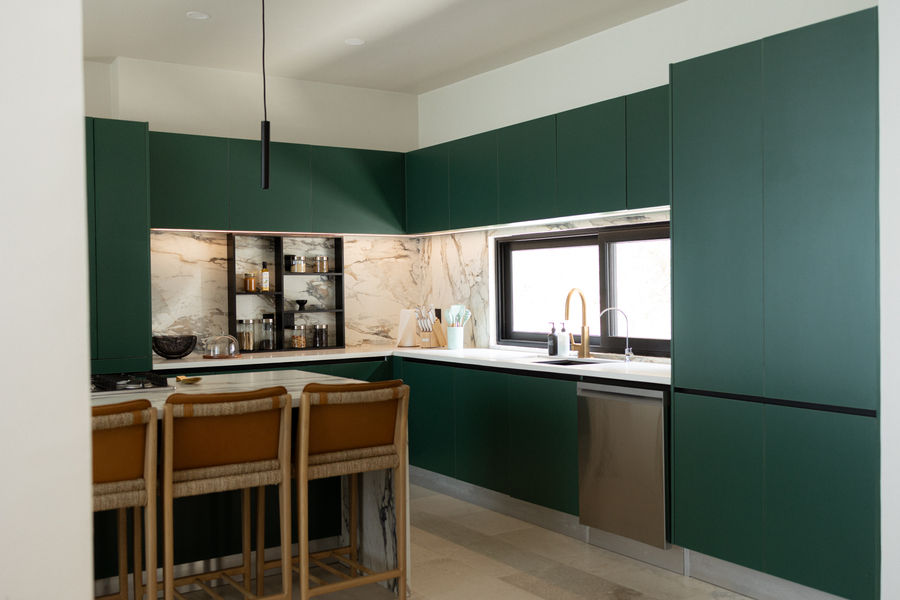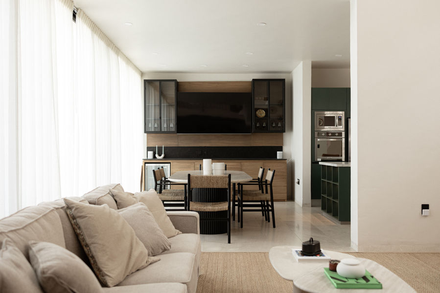 Nuestra cocina y sala de estar se distinguen por un diseño contemporáneo con marcadas influencias mexicanas, donde el verde jade adorna la cocina y materiales regionales enriquecen cada rincón. La cocina integral está cuidadosamente diseñada, destacando una impresionante isla central de piedra tecnológica que optimiza el espacio. Muebles bajos y altos ofrecen generoso espacio de almacenamiento, complementado con accesorios como el magic corner, alacenas con entrepaños extraíbles, una torre de electrodomésticos, especieros y botes de basura ocultos, mejorando significativamente la funcionalidad diaria de la cocina.